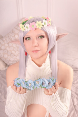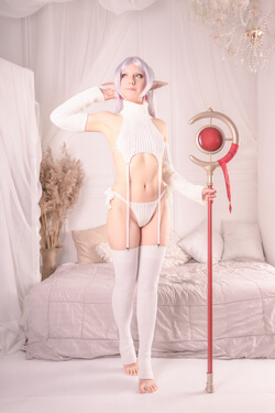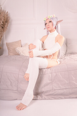 If you ask how many photoshoots I have with Frieren, my answer is: Yes! This time Frieren is wearing the Virgin Destroyer Sweater. This Frieren look was inspired by illustrations created by Cliov.