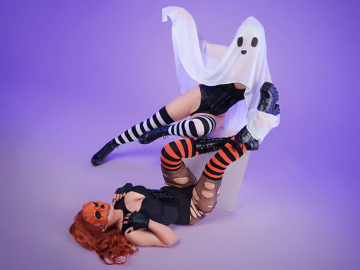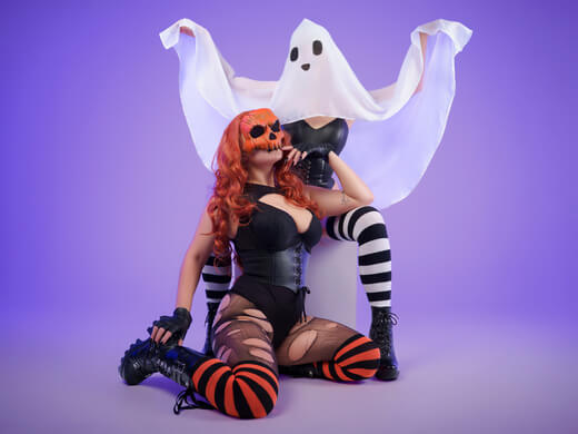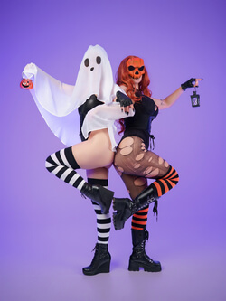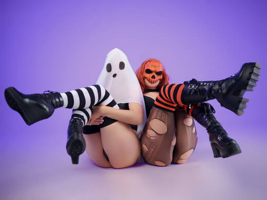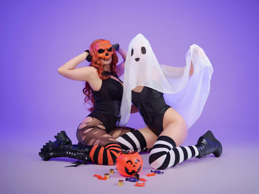 These looks were inspired by various artists artworks featuring ghost girls and pumpkin girls. 👻🎃 We wanted to capture the playful and spooky spirit of Halloween with a touch of fantasy and charm. Soft lights, bold contrasts, and a little bit of mischief — the perfect recipe for a hauntingly cute duo.